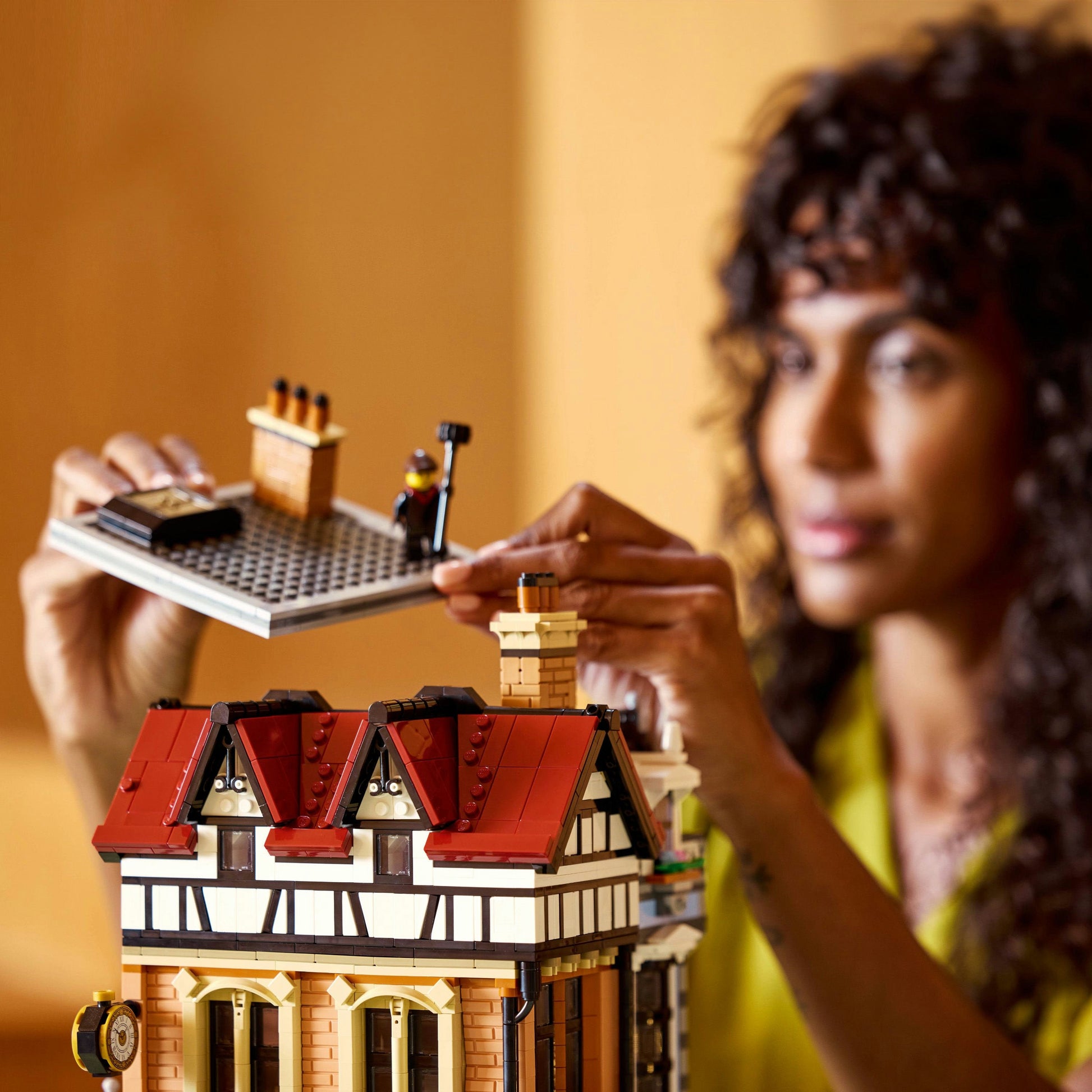 Features include 3 brick-and-timber-style facades complemented by a variety of windows, an exterior staircase and a steeply pitched red roof with rustic chimney stacks. Interior details include a restaurant with a counter, stools and a table; a haberdasher’s adorned with hats and umbrellas; a clockmaker’s workshop with bedside and grandfather clocks; and a snug attic flat. This home office decor set includes 8 minifigure characters and its modular design allows you to rearrange room sections, offering endless possibilities for display and storytelling.