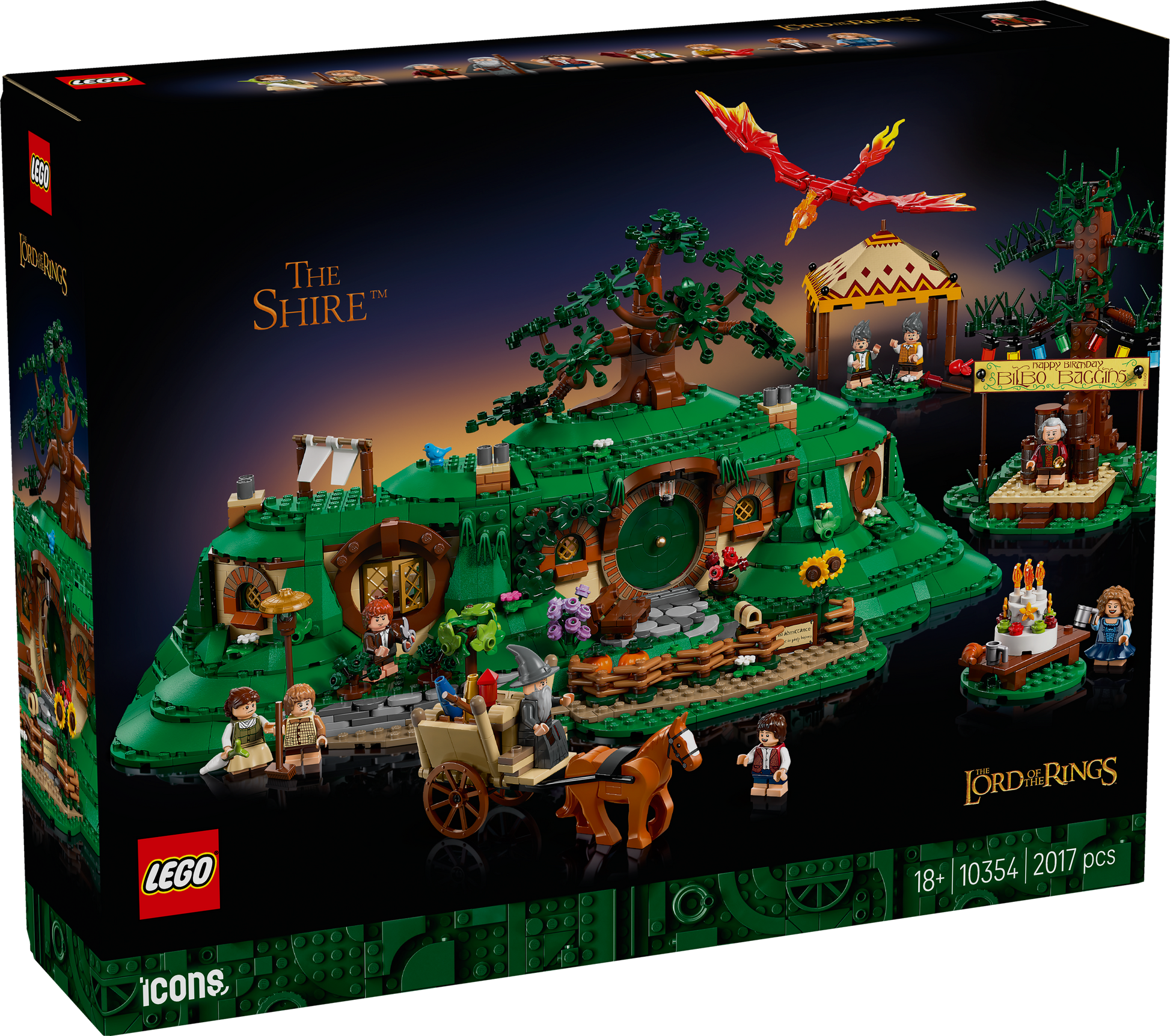 Packed with film-themed details – Includes Gandalf’s horse and cart, fireworks, a firework dragon figure, the Party Tree, party pavilion and Bilbo’s book, which can be displayed open or closed