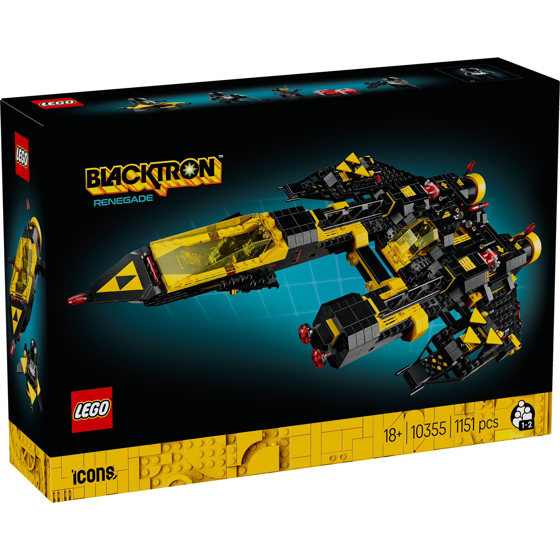 The asymmetric Blacktron Renegade spaceship is recreated in a modular design with new features, including a planet-rover drop pod, landing gear, 2 wing-mounted space speeders and 2 engine energy canisters. The model comes with 3 Blacktron minifigures and a droid figure, and it can be rebuilt, via online building instructions, into an enhanced version of the 1980s LEGO Alienator.