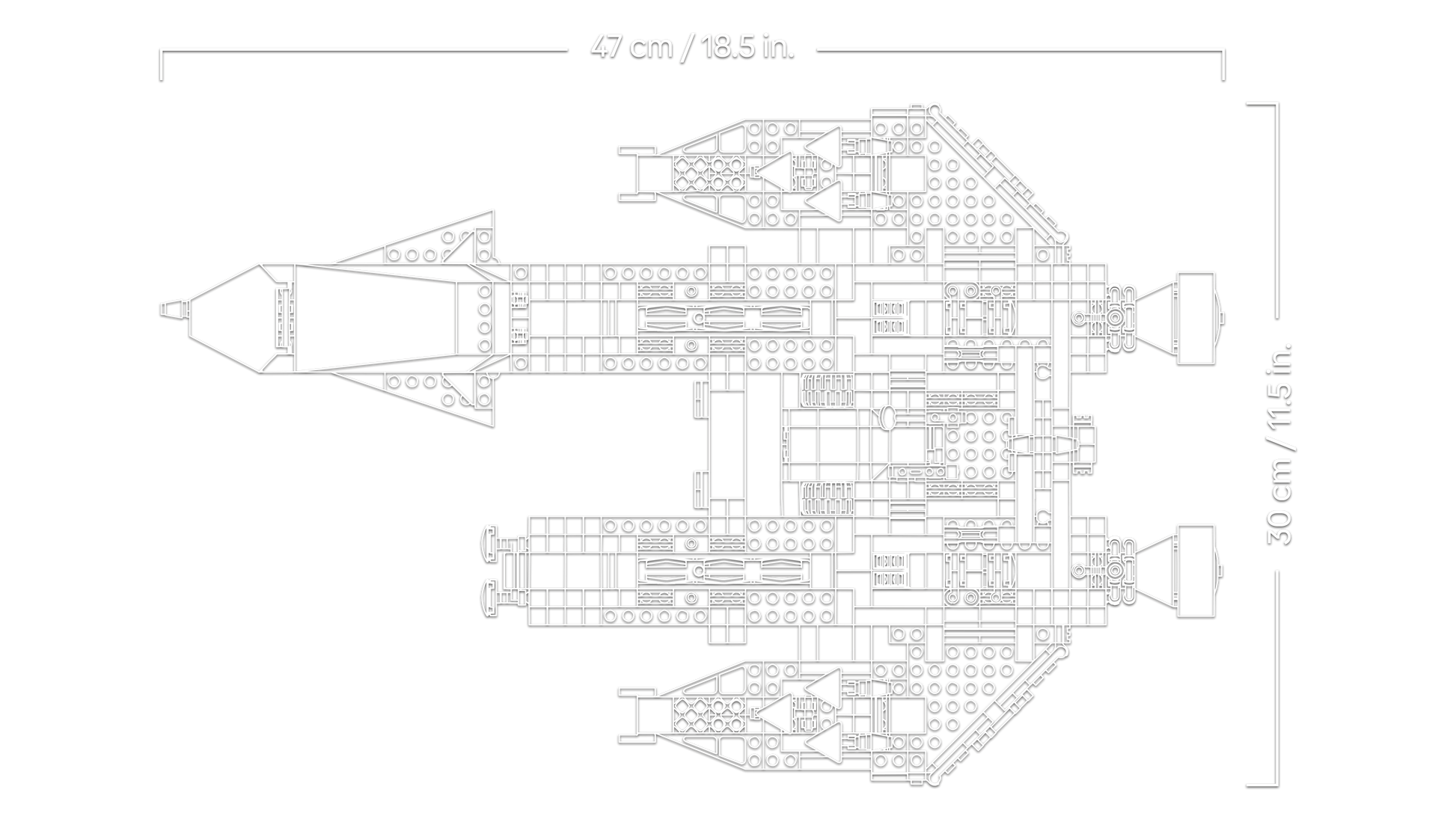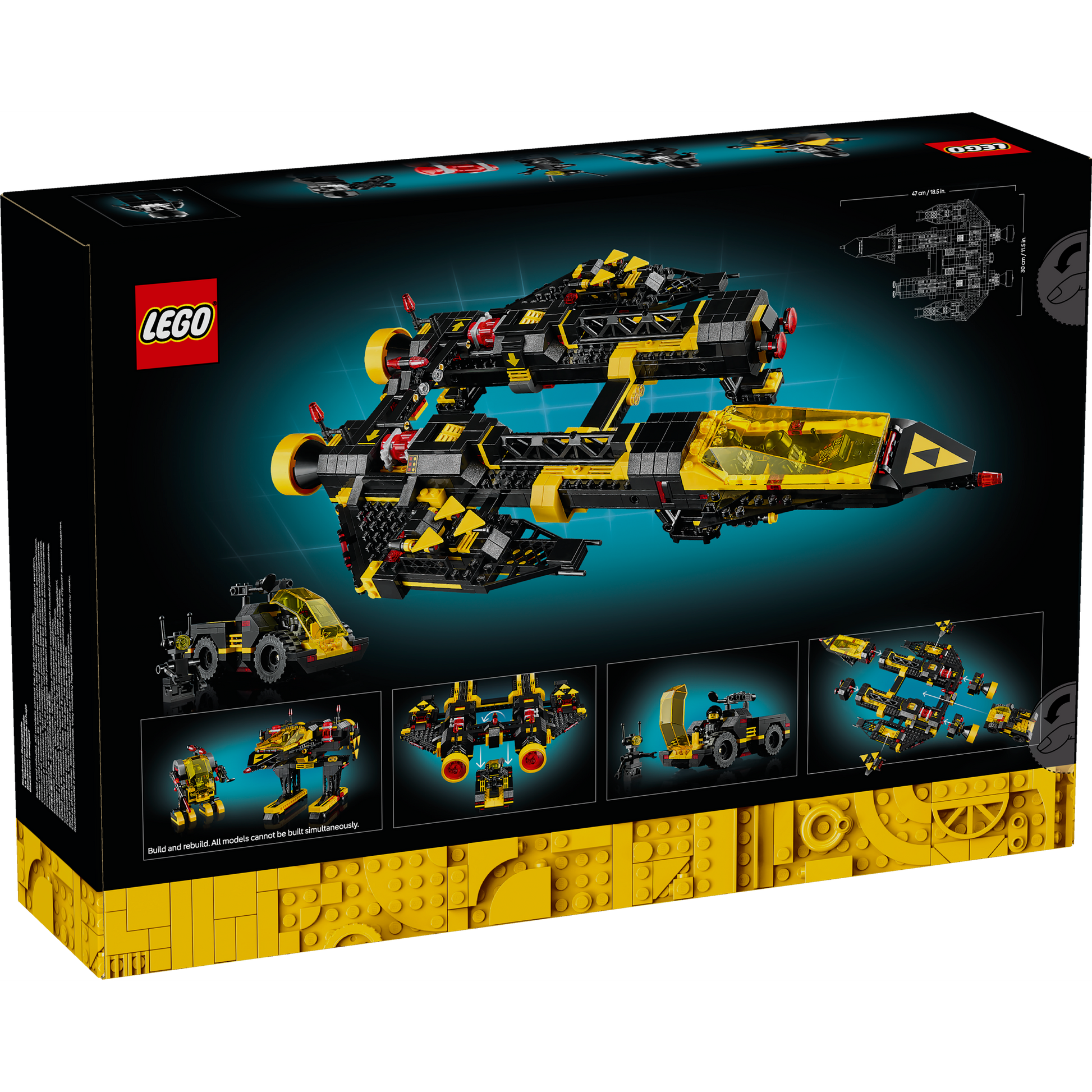 Dimensions – The Blacktron Renegade spaceship in this 1,151-piece building set measures over 9 cm (3.5 in.) high, 47 cm (18.5 in.) long and 30 cm (11.5 in.) wide