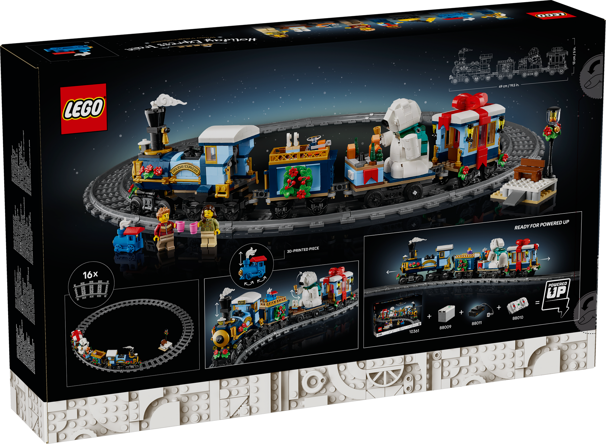 Dimensions – The 4-carriage Holiday Express Train in this 956-piece building set measures over 13 cm (5 in.) high, 49 cm (19.5 in.) long and 7 cm (2.5 in.) wide