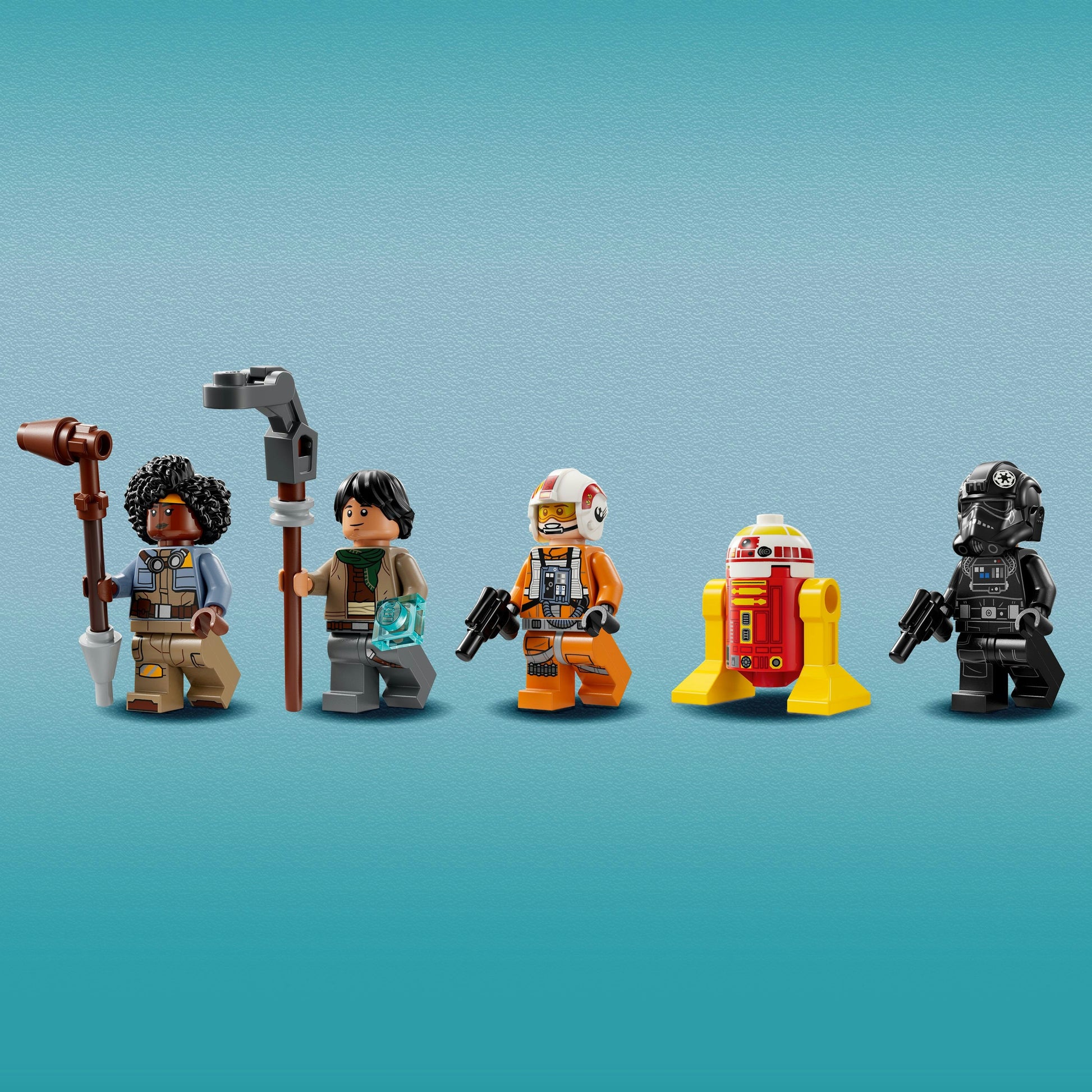 • 4 LEGO® Star Wars™ minifigures and a LEGO droid figure – A Rebel Pilot and a TIE Pilot, each with blaster pistols, Yesi Scala with a gaffi stick, and Sig Greebling, plus an L3-G0 droid LEGO figure