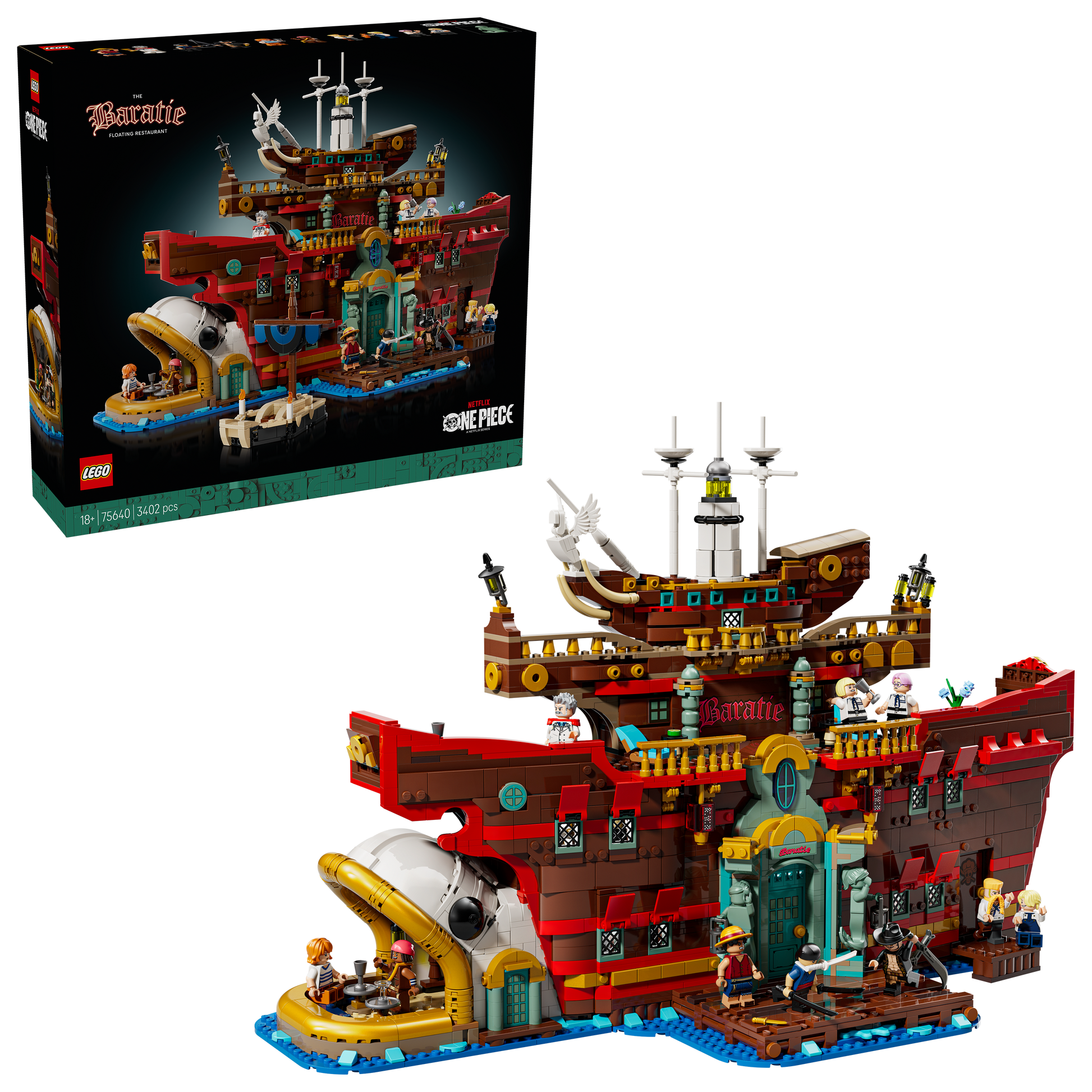 LEGO® ONE PIECE The Baratie Floating Restaurant (75640) recreates the iconic setting of many ONE PIECE adventures. A great gift for adult fans of the ONE PIECE Netflix live action show, the model is packed with authentic details and an iconic cast of minifigures from the show. This impressive ship-shaped display piece contains many accessible rooms within its interior, including kitchen and dining areas, Zeff’s quarters and the treasure room. Classic scenes can be reproduced with the 10 LEGO minifigures: Luffy, Zoro, Nami, Usopp, Sanji, Zeff, Garp, Helmeppo, Koby and Mihawk. This kit also contains authentic accessories, including 5 'Wanted' posters. The LEGO Builder app lets users zoom in, rotate models in 3D and track progress as they build. The extensive LEGO Sets for Adults range offers model-builders an immersive and rewarding experience. Contains 3,402 pieces.