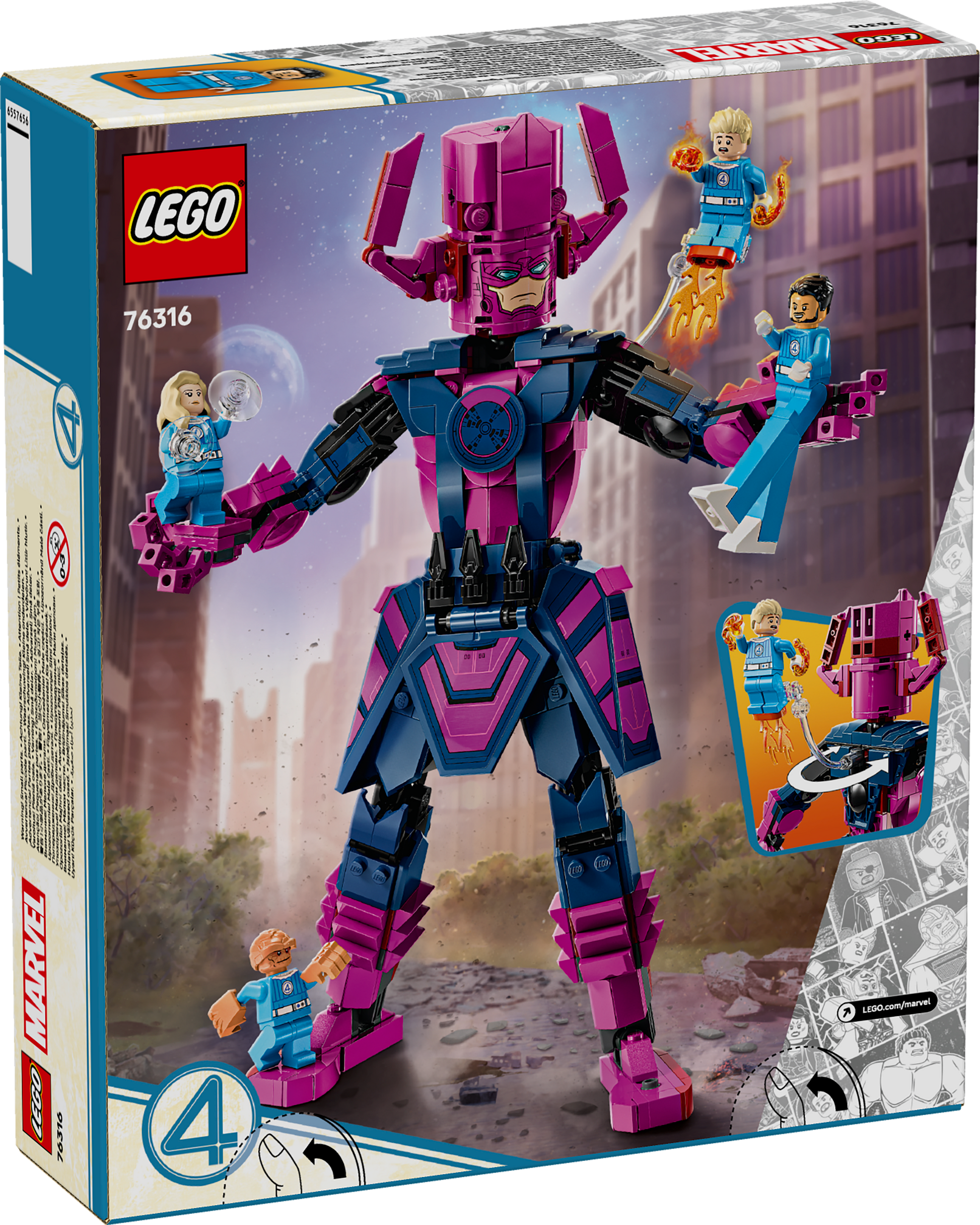 Fans of Marvel Studios’ The Fantastic Four: First Steps can recreate the film’s action with LEGO® ǀ Marvel Fantastic Four vs. Galactus Construction Figure (76316), the first ever LEGO Fantastic Four set! This impressive gift for boys and girls aged 9 plus is a build-and-play LEGO ǀ Marvel set for kids who love Super Hero adventures. The buildable LEGO ǀ Marvel Fantastic Four toy includes 4 minifigures: Mr. Fantastic, featuring extendable legs; Human Torch, with 2 hand blasters and flame elements attached to his feet, plus a transparent support that enables him to ‘fly’; Invisible Woman holding 2 force shields; and The Thing with his large, powerful hands. A fully jointed construction figure of the film’s iconic villain, Galactus, stands over 28 cm (11 in.) tall. This posable construction figure prompts endless action as he battles the Super Heroes. For added digital fun, builders can zoom in, rotate models in 3D and track progress using the fun, intuitive LEGO Builder app. Set contains 427 pieces.