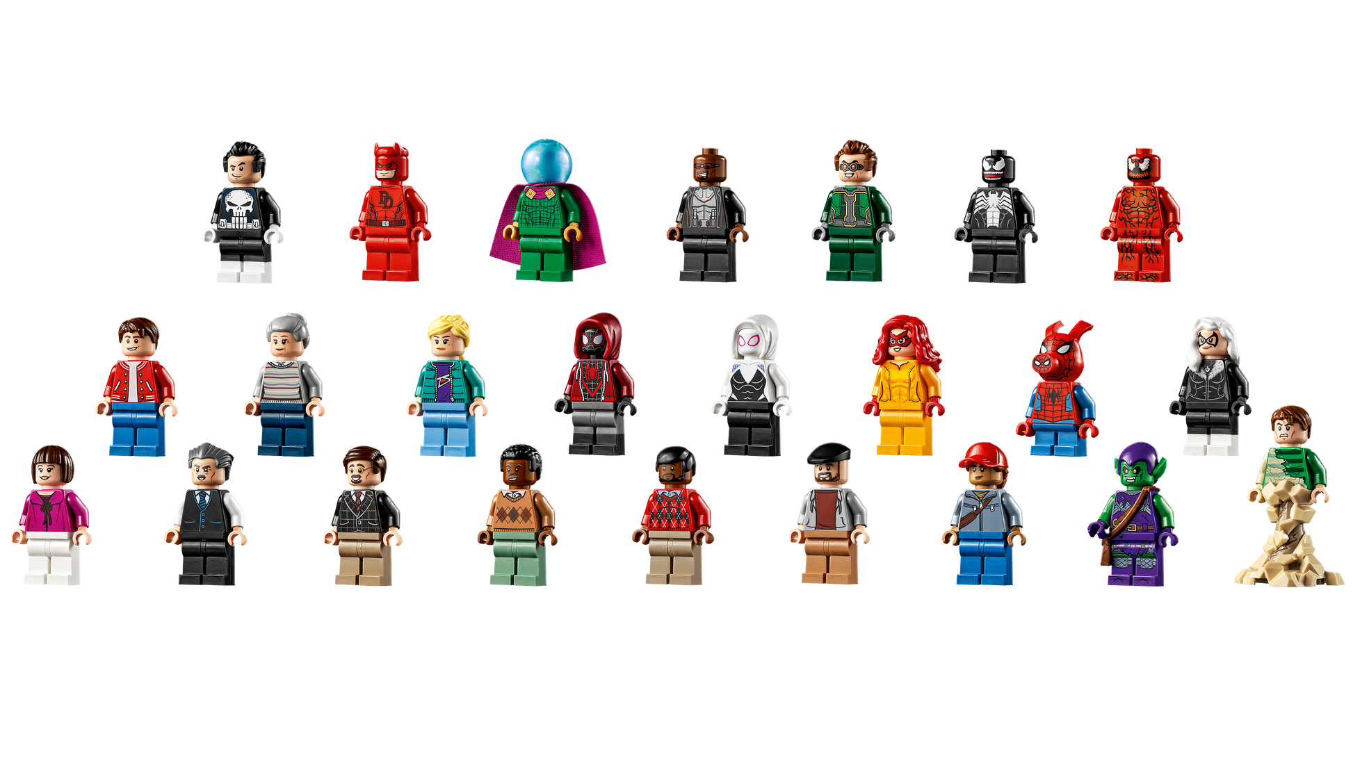 25 minifigures bring life to the set: Doctor Octopus, Spider-Man, Venom, Miles Morales, Spider-Ham, Green Goblin, Peter Parker, Spider-Gwen, Mysterio, Sandman, Robbie Robertson and many more!