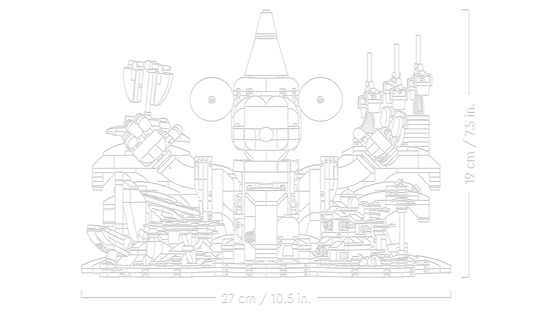 Dimensions – This 1,103-piece LEGO® brick-built Disney model measures over 19 cm (7.5 in.) high, 27 cm (10.5 in.) wide and 17 cm (6.5 in.) deep