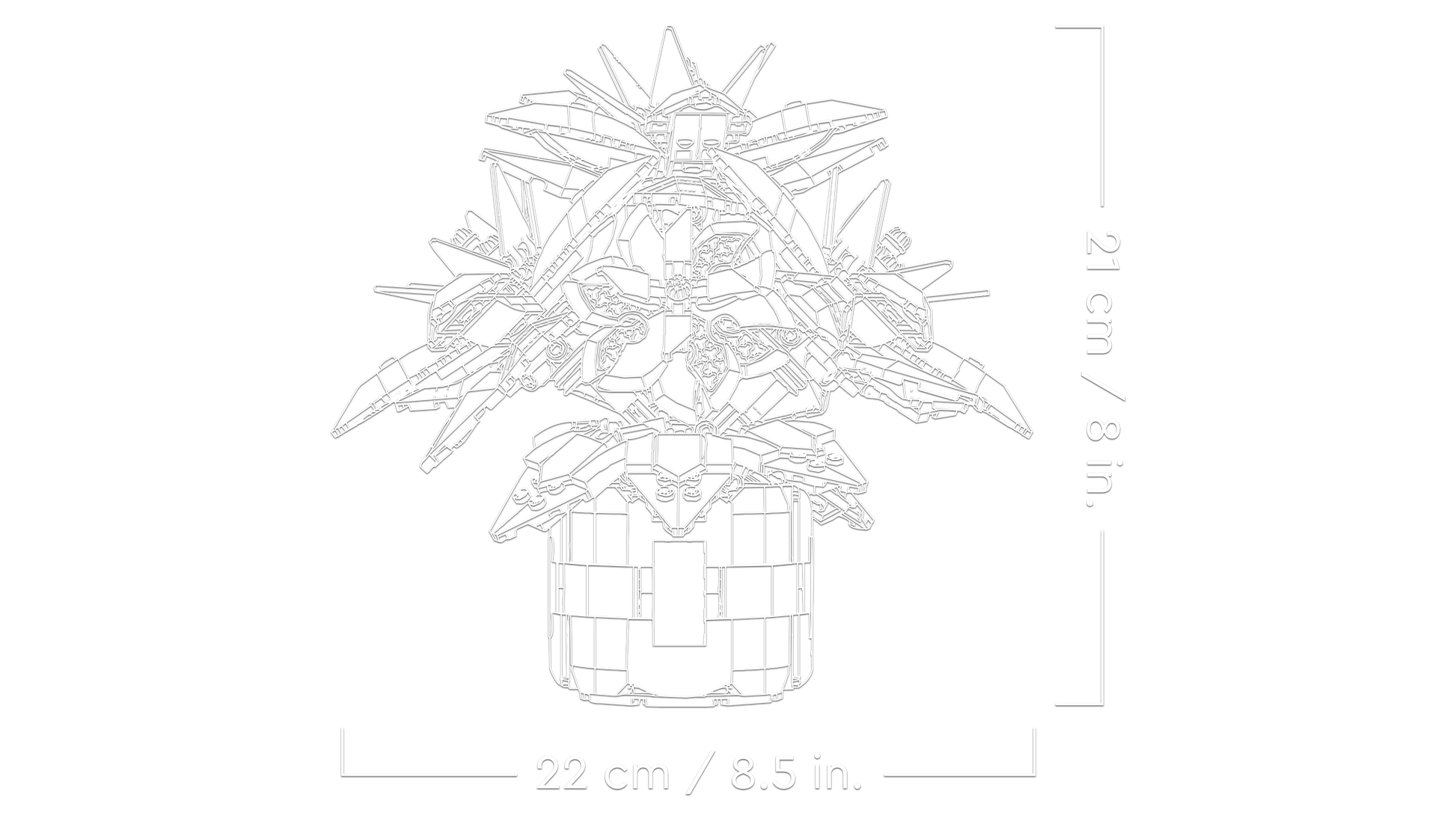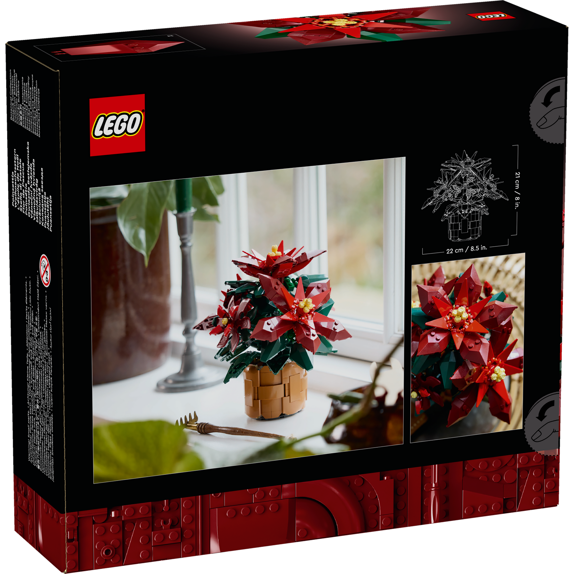 Dimensions –The poinsettia plant, including the flowerpot, in this 608-piece building set measures over 8 in. (21 cm) high, 8.5 in. (22 cm) wide and 6.5 in. (17 cm) deep