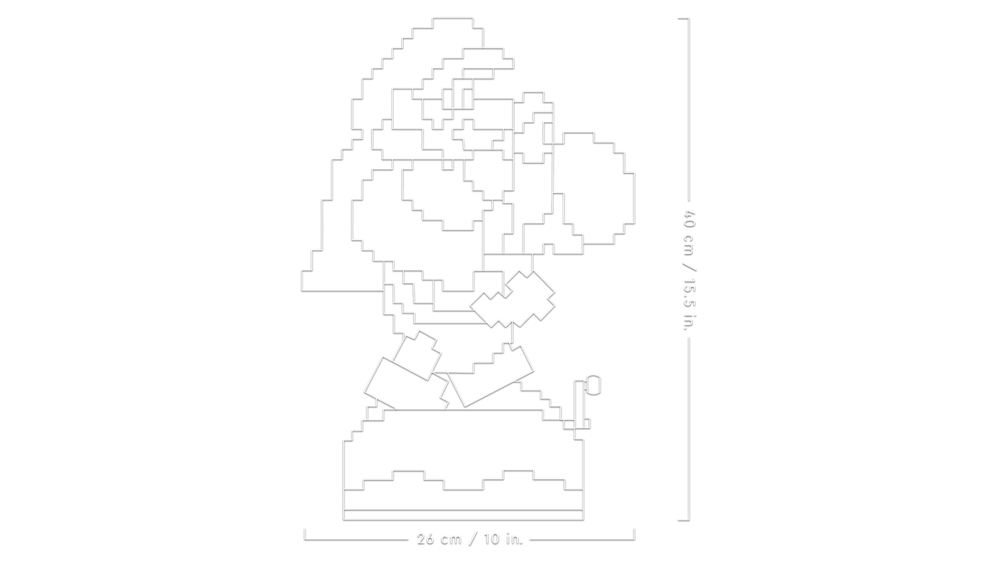 • Measurements – This 1,215-piece display model measures over 40 cm (15.5 in.) high, 26 cm (10 in.) wide and 11 cm (4 in.) deep and makes fun room decor in any Super Mario™ fan’s home or office
