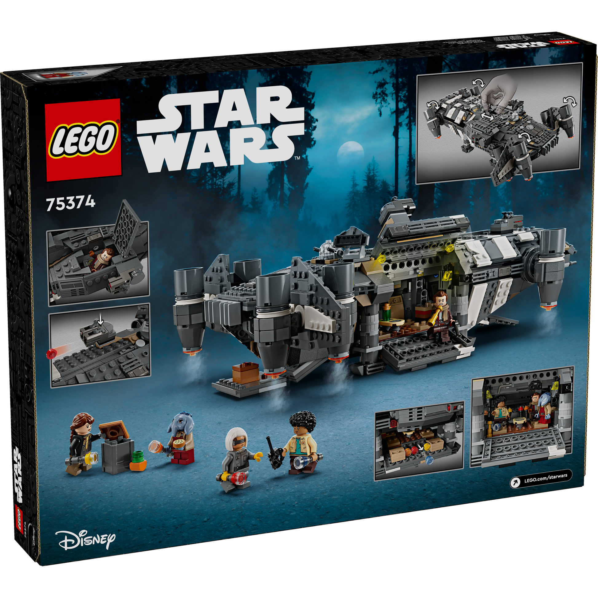 Kids become the heroes in their own Star Wars: Skeleton Crew stories with a detailed LEGO® brick recreation of The Onyx Cinder (75374). This collectible LEGO Star Wars™ buildable starship toy features rotating engines for landing/takeoff or flight, 2 stud shooters, 2 rotating turrets, each with 2 stud shooters, and a grabbing claw. It has seats for all 5 included LEGO Star Wars characters (the Jod LEGO minifigure in the cockpit and Wim, Fern, KB and Neel in the passenger compartment), plus storage for the 4 buildable flashlights and other cargo. There is also a kitchen table and a bed, plus accessory elements including fruit and a walkie-talkie to inspire creative play. A top LEGO gift idea for Star Wars fans and collectors of Star Wars memorabilia aged 10+, this vehicle toy building set comes with step-by-step instructions. Be sure to check out the LEGO Builder app for zoom and rotate digital viewing tools to add to the creative experience.